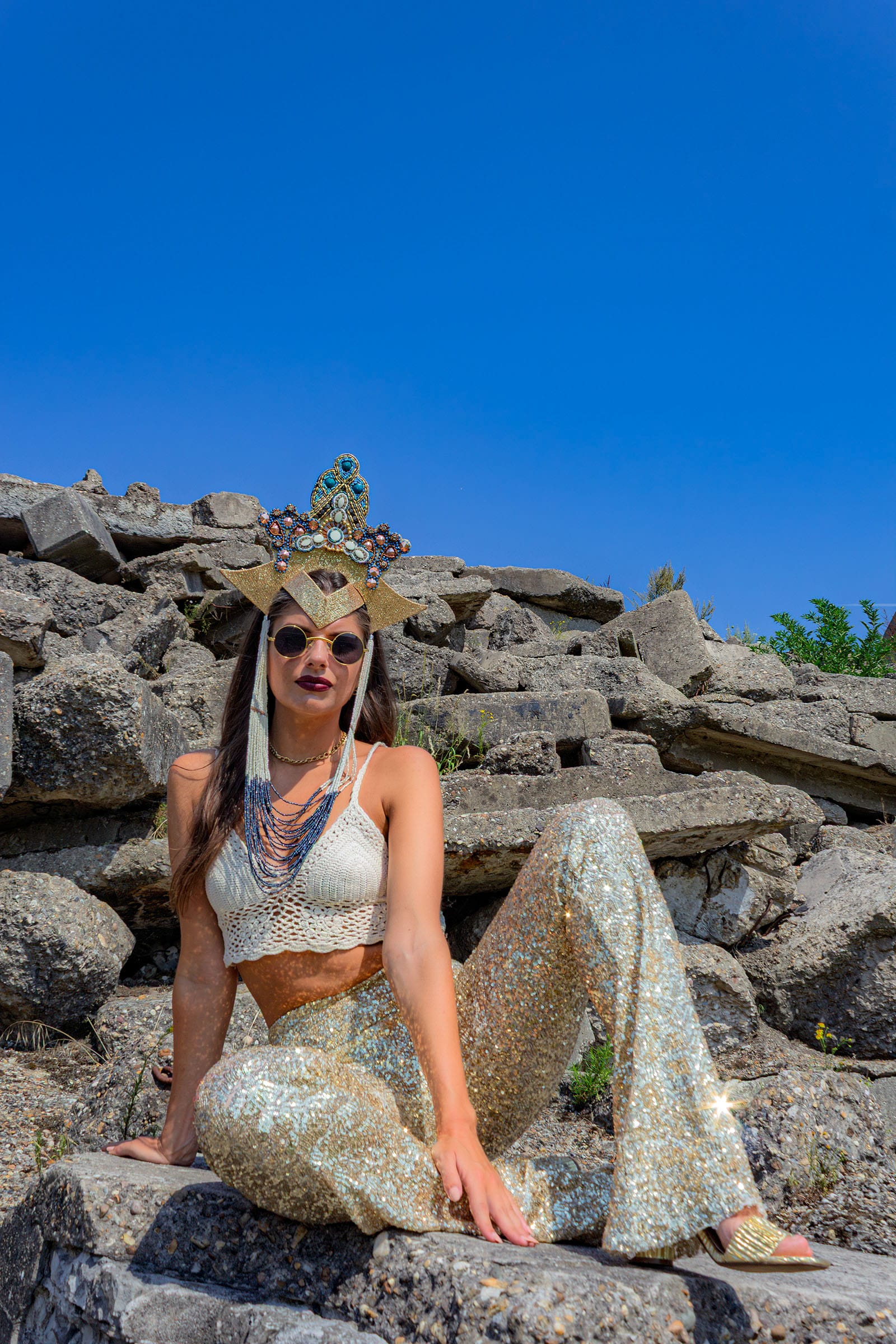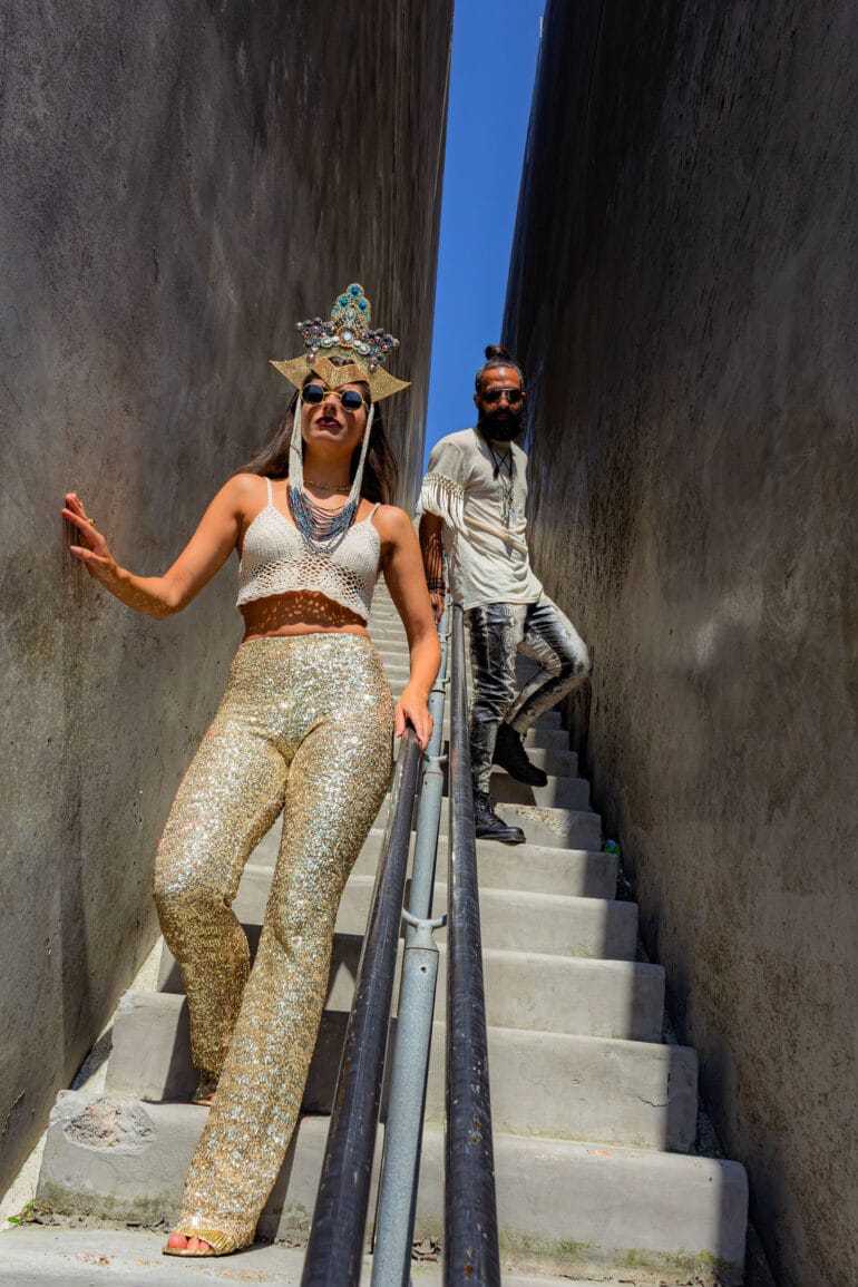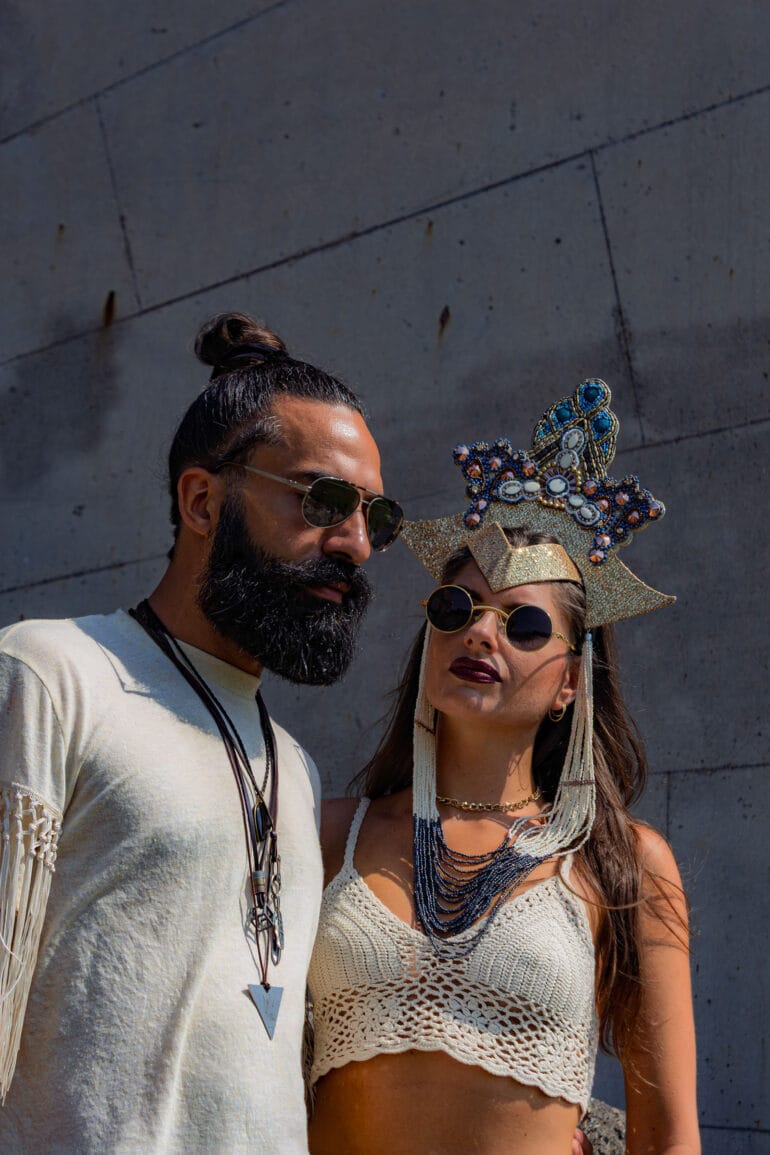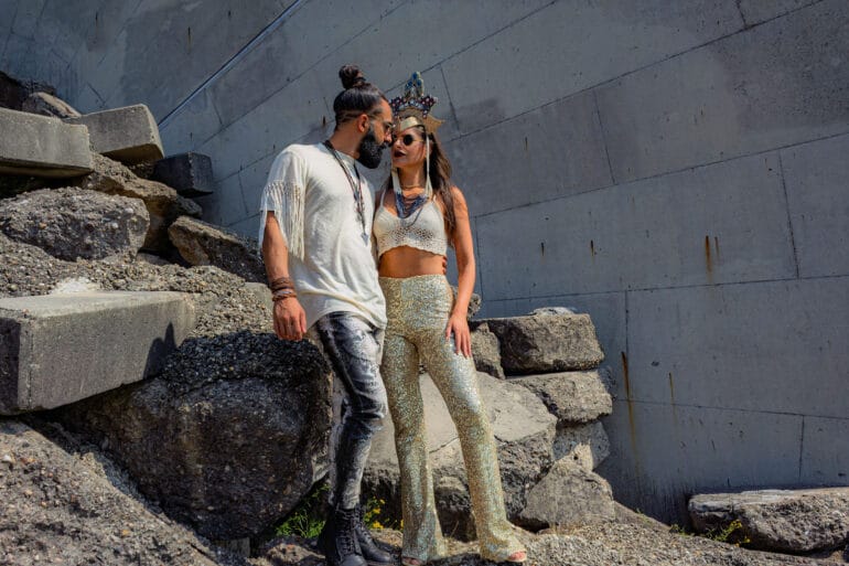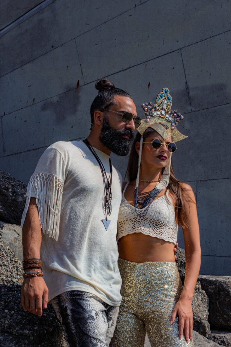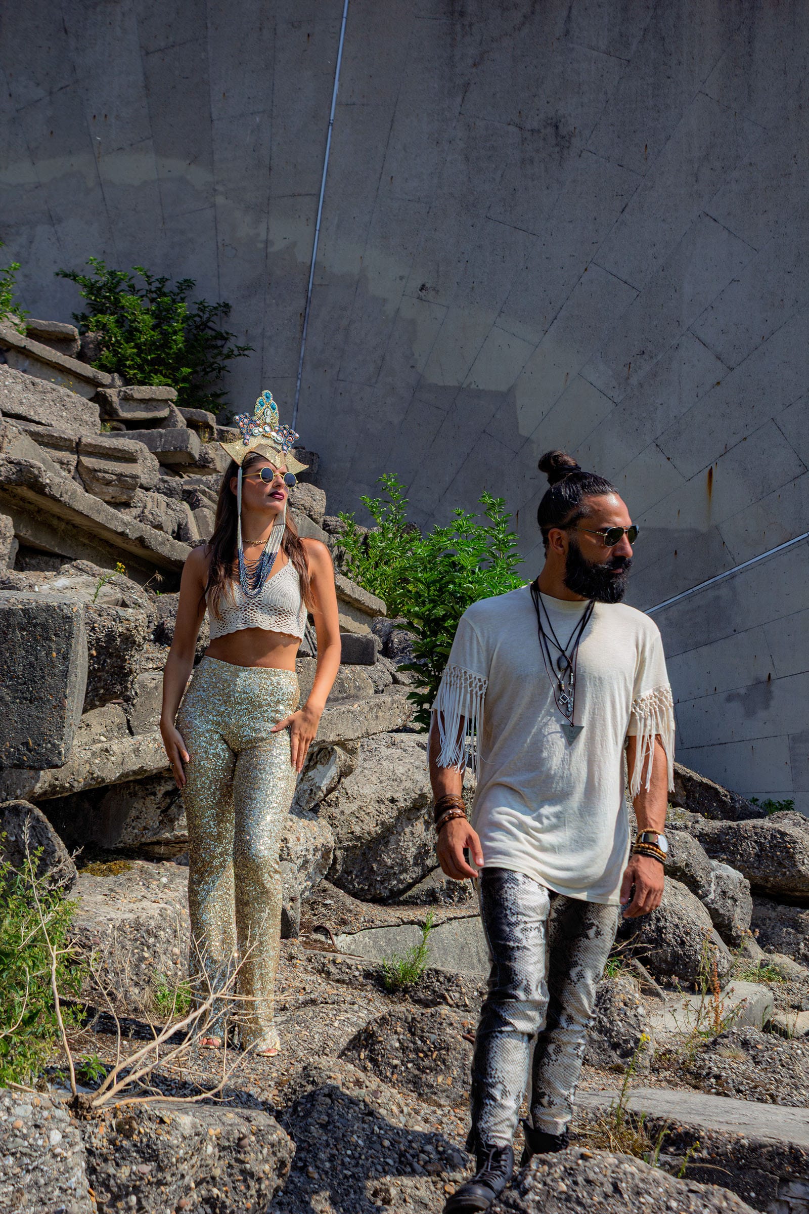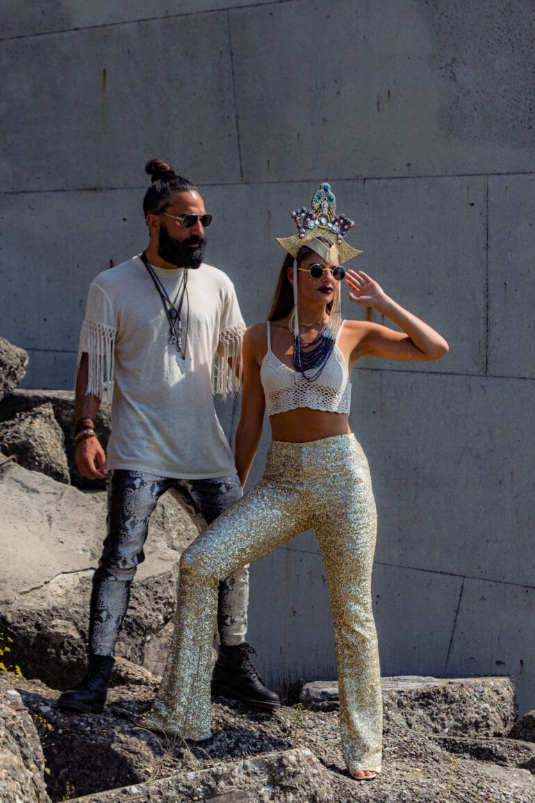 He keeps it untamed in a cream fringe t-shirt and cream python leather trousers. She brings the shine with gold sequinned flared trousers, a cream crochet top, and a gold headpiece that catches every sunray like a whispered secret.