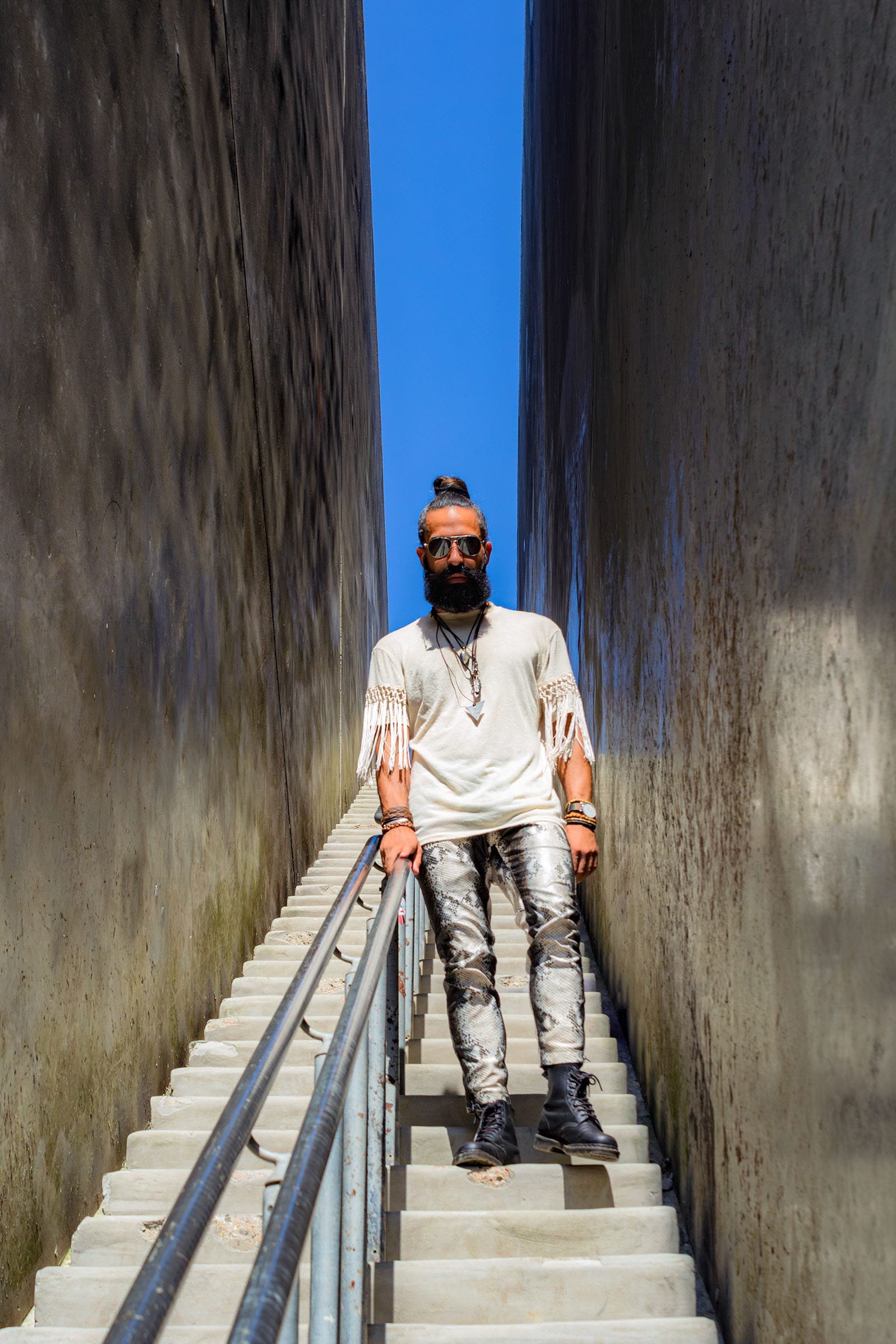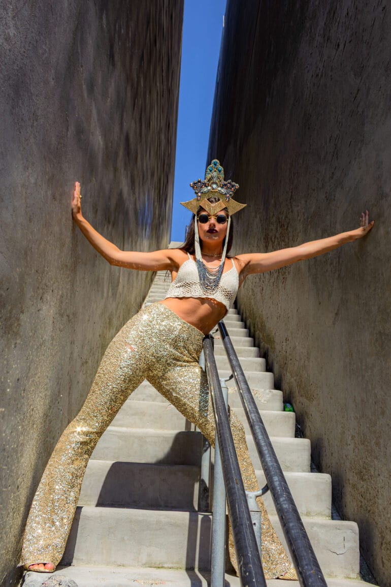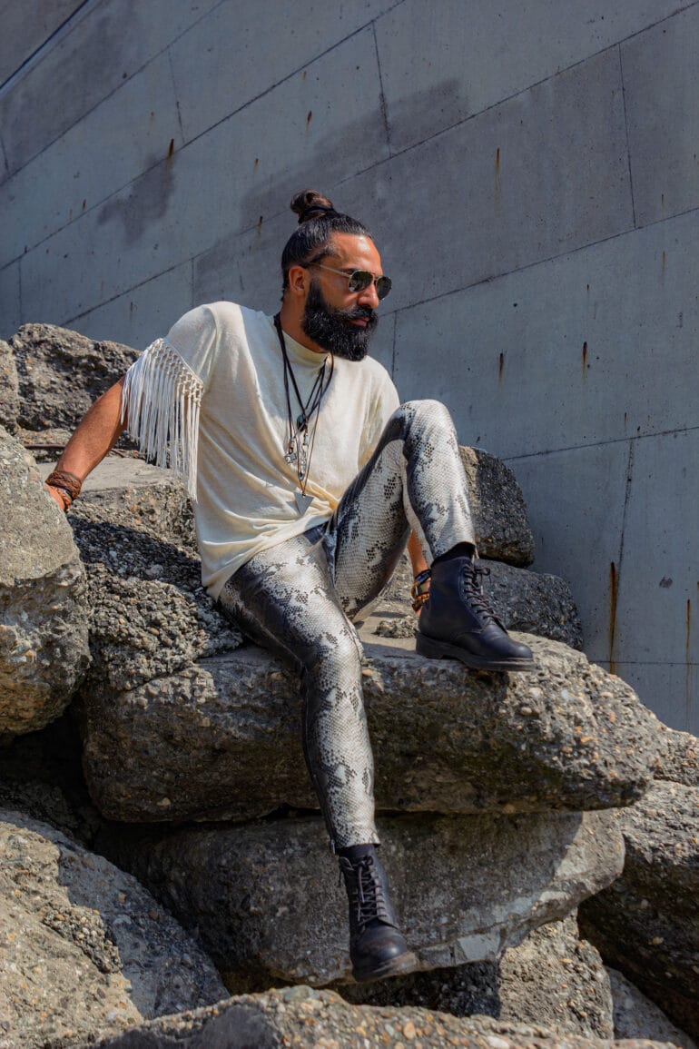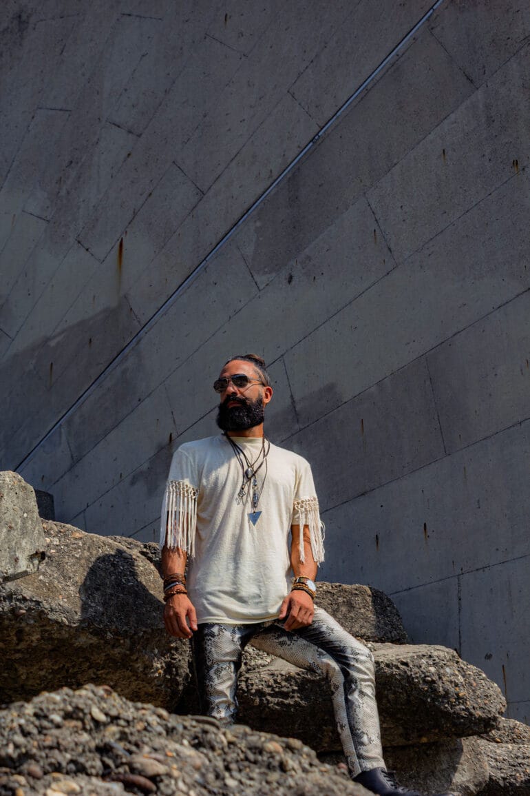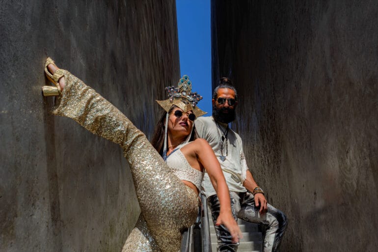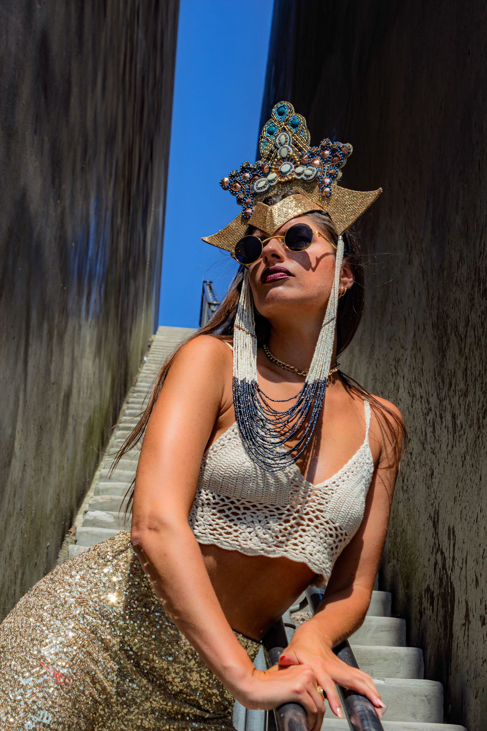 He keeps it untamed in a cream fringe t-shirt and cream python leather trousers. She brings the shine with gold sequinned flared trousers, a cream crochet top, and a gold headpiece that catches every sunray like a whispered secret.