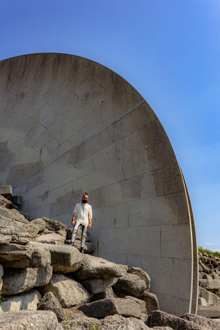 Around a towering rock art piece with stone stairs under open skies and drifting wind, the scene feels a little cosmic, with just a splash of desert dream.