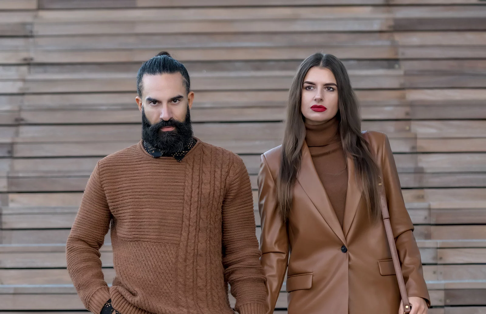 Showcasing our beloved ton-sur-ton style, we wear monochrome looks in caramel and chestnut browns. Head-to-toe cognac outfits frequented fashion weeks around the globe before the pandemic. Will trends fizzle out sooner under these circumstances? Her daring all-leather suit in cognac says “NO”. The classic silhouette, paired with high heels and red lips is rendered timeless. Mirrored by the fashion-forward combination of a thick winter sweater with snake print leather pants worn by him. The shirt underneath in a similar print and multi coloured brogues hold onto a matching, warm brown color palette. Just like we are holding onto warm thoughts.