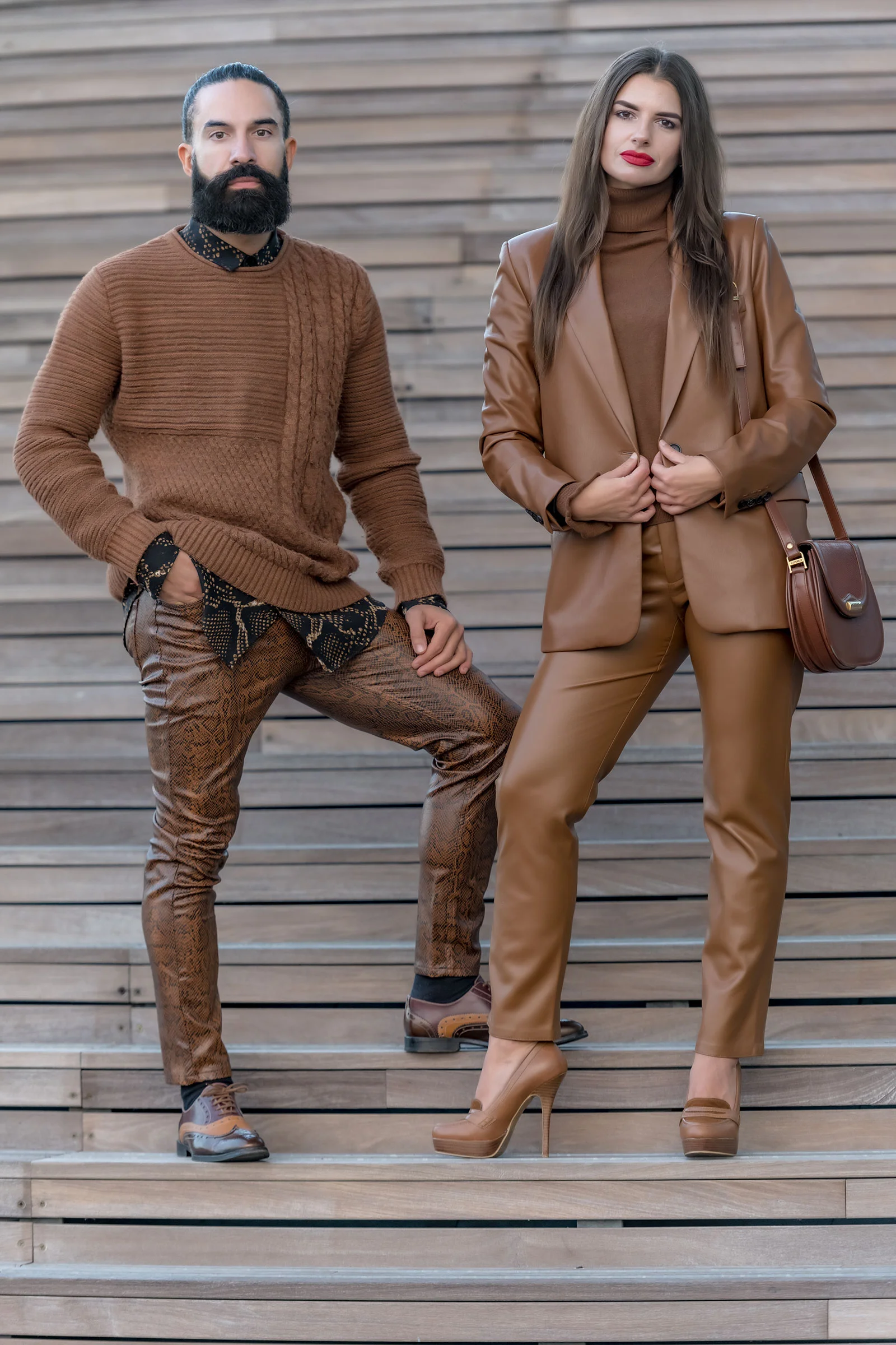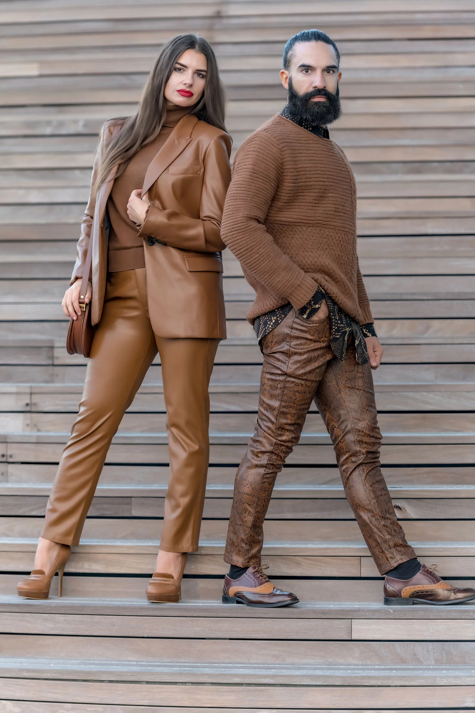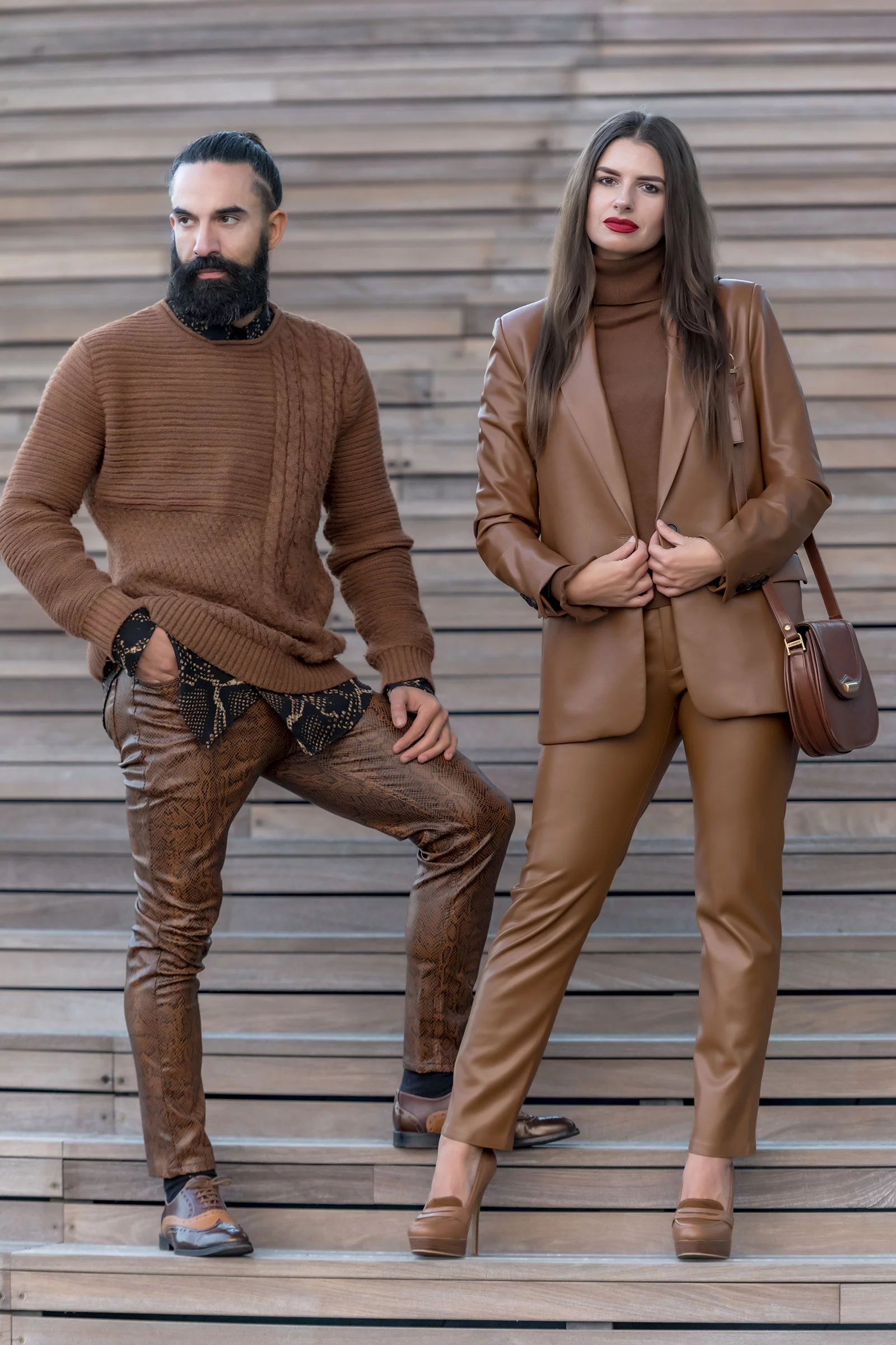 Showcasing our beloved ton-sur-ton style, we wear monochrome looks in caramel and chestnut browns. Head-to-toe cognac outfits frequented fashion weeks around the globe before the pandemic. Will trends fizzle out sooner under these circumstances? Her daring all-leather suit in cognac says “NO”. The classic silhouette, paired with high heels and red lips is rendered timeless. Mirrored by the fashion-forward combination of a thick winter sweater with snake print leather pants worn by him. The shirt underneath in a similar print and multi coloured brogues hold onto a matching, warm brown color palette. Just like we are holding onto warm thoughts.