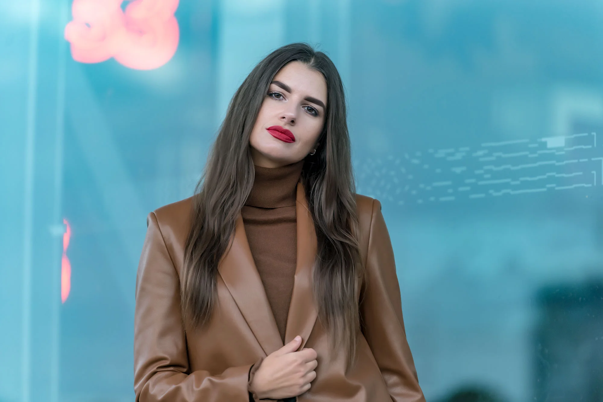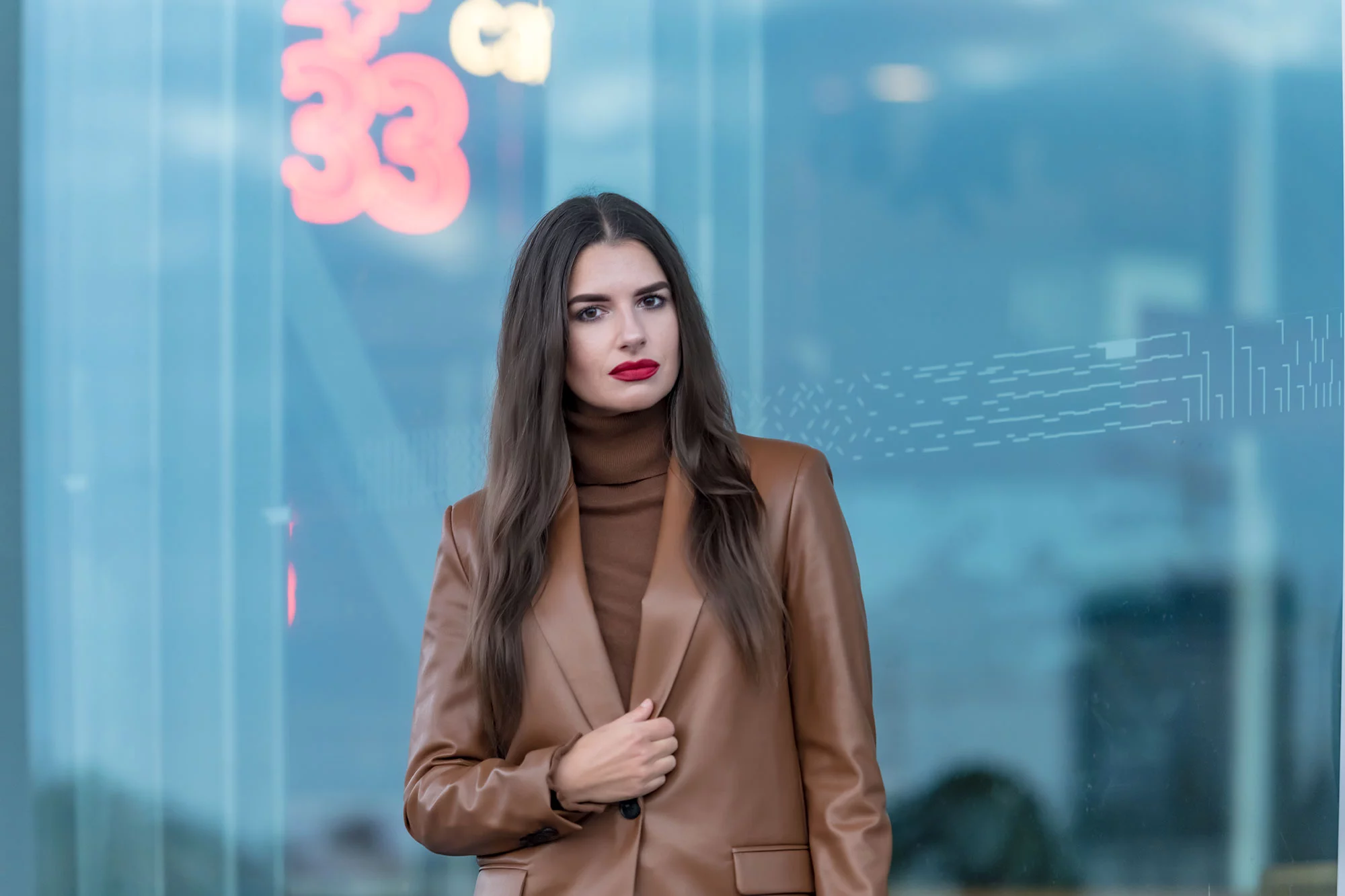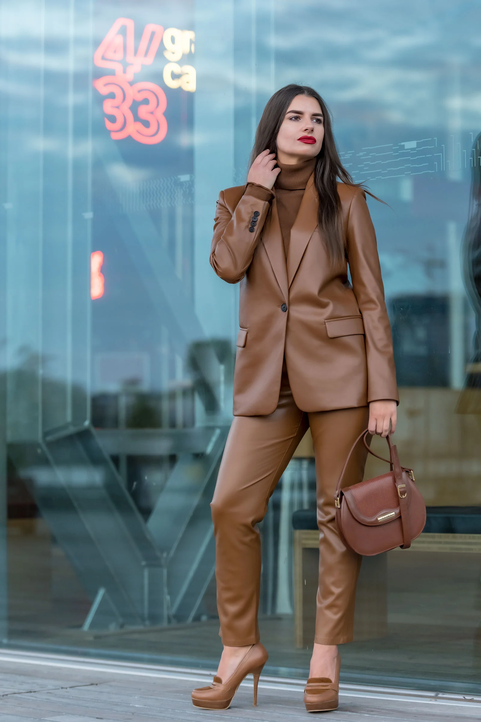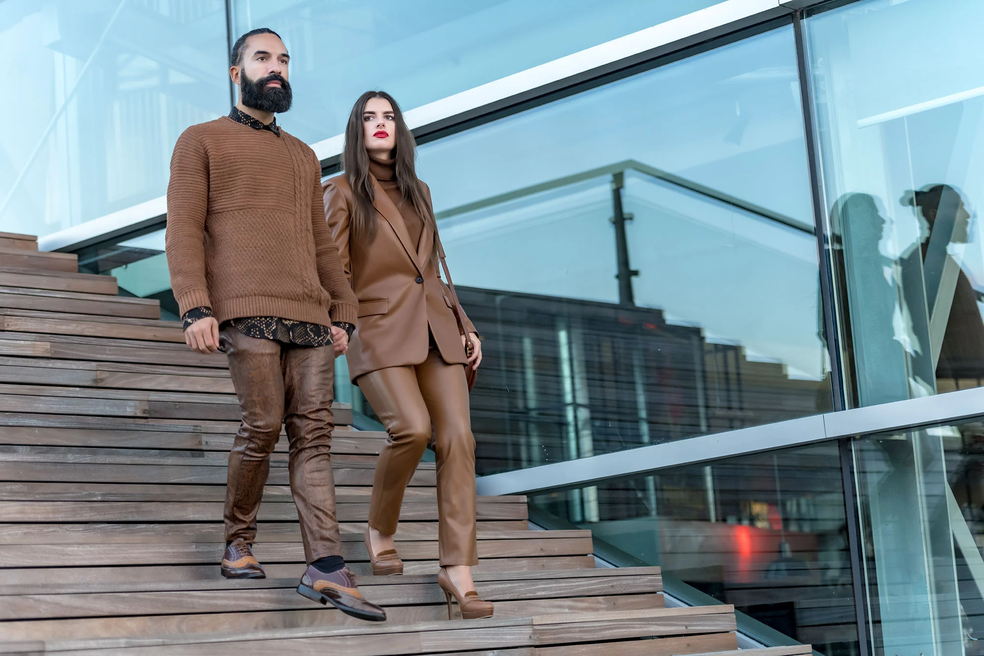 Showcasing our beloved ton-sur-ton style, we wear monochrome looks in caramel and chestnut browns. Head-to-toe cognac outfits frequented fashion weeks around the globe before the pandemic. Will trends fizzle out sooner under these circumstances? Her daring all-leather suit in cognac says “NO”. The classic silhouette, paired with high heels and red lips is rendered timeless. Mirrored by the fashion-forward combination of a thick winter sweater with snake print leather pants worn by him. The shirt underneath in a similar print and multi coloured brogues hold onto a matching, warm brown color palette. Just like we are holding onto warm thoughts.